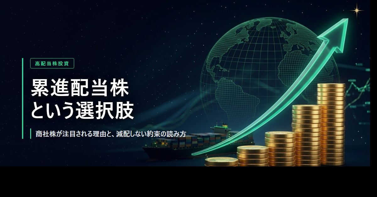 連続増配株という選択肢の記事で「実績ベース」の増配株について整理しました。今回はその続編として、「方針ベース」で減配せず、配当を維持または増配すると公約している累進配当株を取り上げます。商社株が累進配当を打ち出している背景、IR資料での読み解き方、そして方針撤回や利回り低下といったリスクまで、私自身が銘柄を選ぶときに確認しているポイントを整理します。